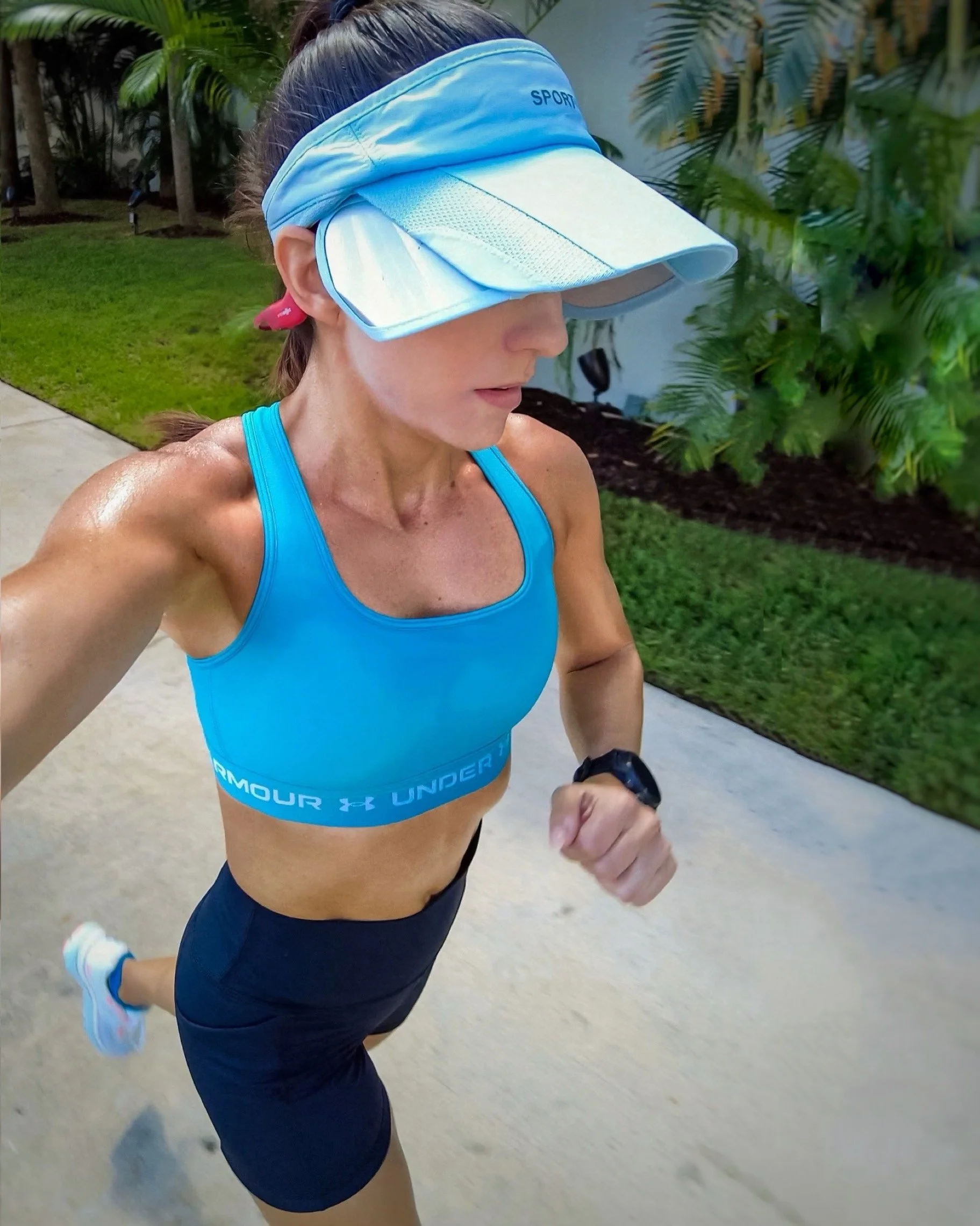 You’ll rarely see me training without a hat. That’s because I’m a stickler for clear skin, thanks to a lifetime of acne and now more recently melasma, so the sun and heat are a major and primary cause of scaring and discoloration. Every single time I share a post with my retractable brim visor, I get dozens of comments and DMs for the link so I’ll share all about it here! I have this one in three colors and plan on purchasing the others soon, because it is the best piece of gear ever created.